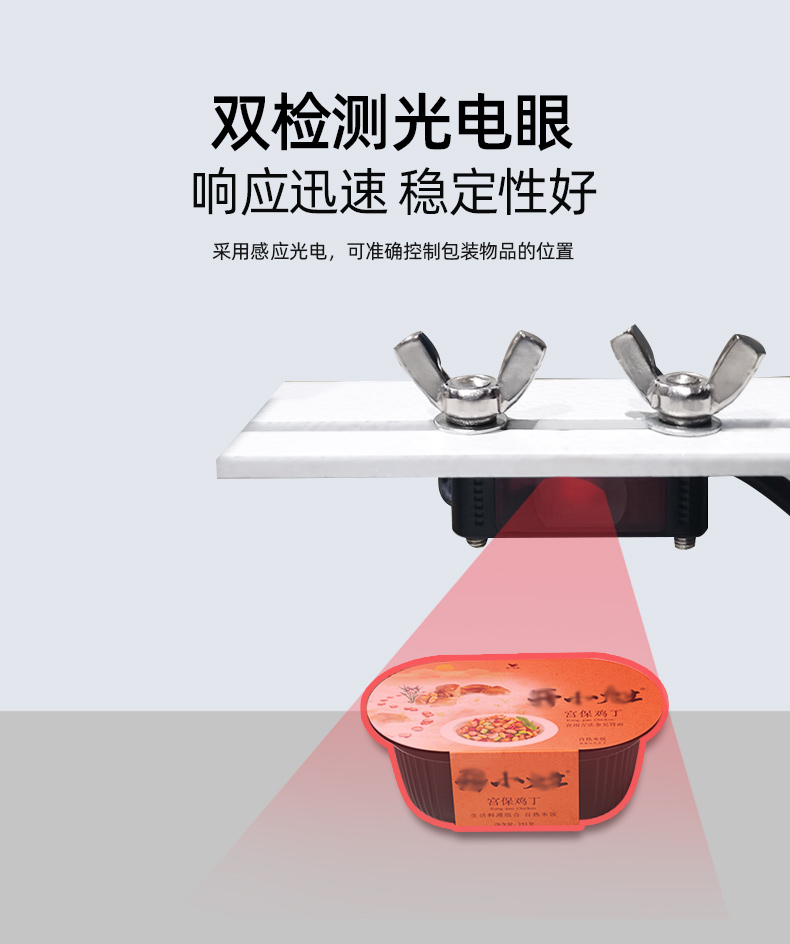 6、雙檢測(cè)光電眼,水平和垂直各1組,穩(wěn)定性好,相應(yīng)迅速,可以包裝很薄的產(chǎn)品