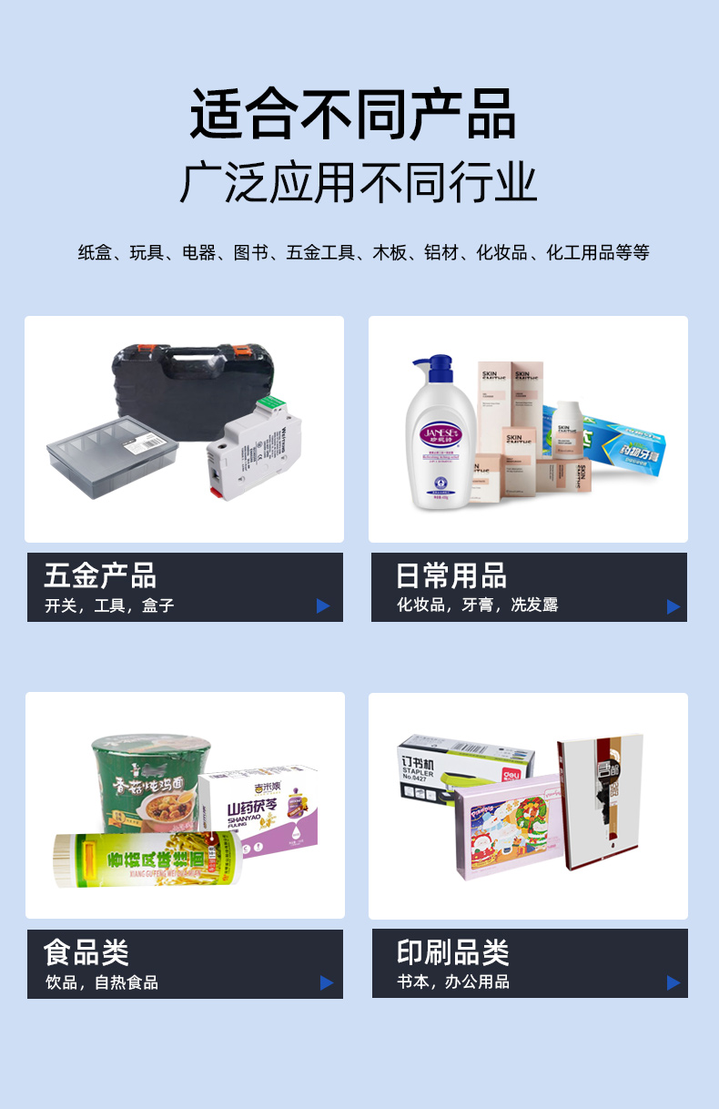 廣泛應(yīng)用于紙盒、玩具、電子、電器、文具、圖書(shū)、唱片、五金工具、地板、木板、建材、鋁材、日用品、藥品、飲料、化妝品、化工用品、工藝品、標(biāo)簽等商品的熱收縮包裝。