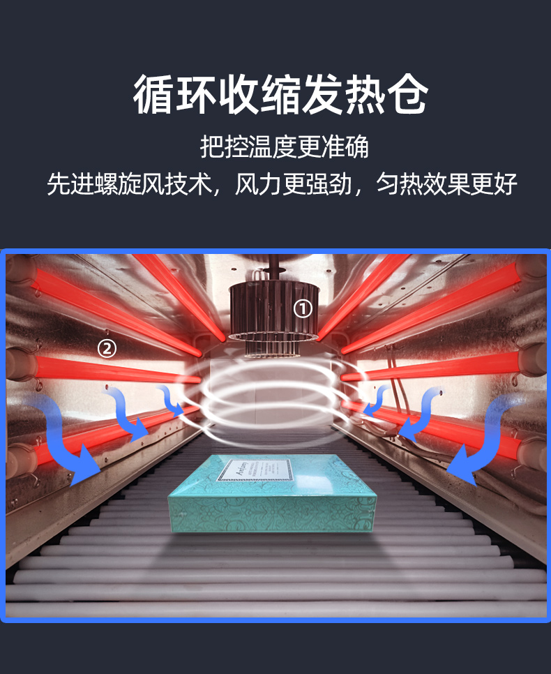3、采用遠(yuǎn)紅外線(xiàn)加熱管,將熱量直接傳送到收縮膜表面,收縮效率特佳