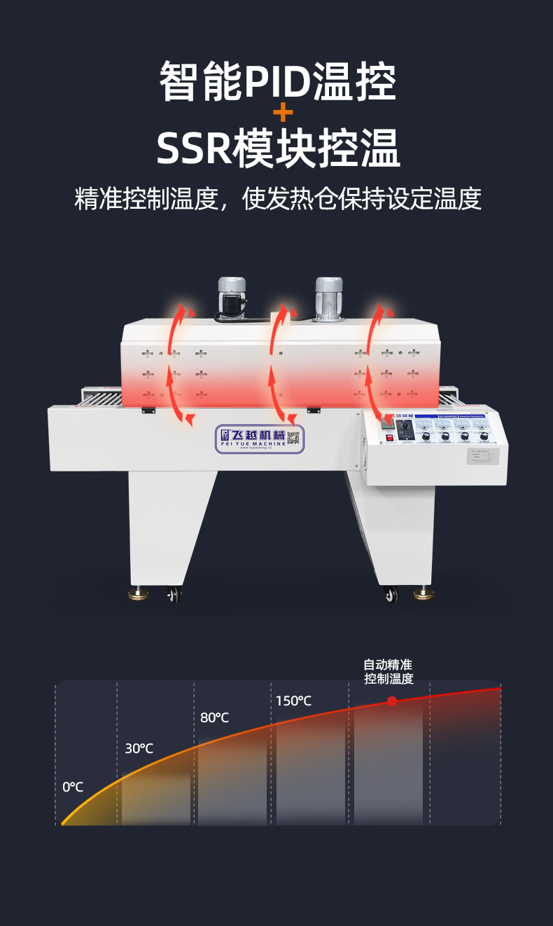 4、輸送輥筒采用玻璃纖維套管,不會(huì)燙壞包裝物,高溫也不會(huì)出現(xiàn)粘膜、套管變形現(xiàn)象