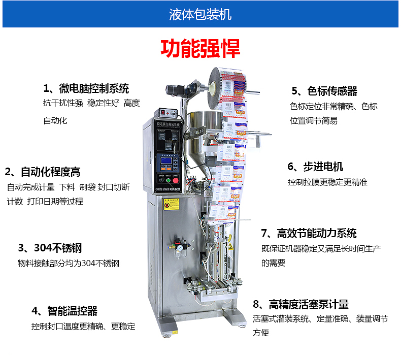 液體包裝機(jī),廣泛適用于食品、醫(yī)藥、日用、化工等行業(yè)中的液體、膏體、混合醬料,如水、醋、醬油、蜂蜜、果汁飲料、果醬、酸奶、豆奶、洗發(fā)露、洗發(fā)水、沐浴露、洗衣液、食用油、番茄醬、芝麻醬、花生醬、辣椒油、蒜蓉醬、沙茶醬、果醬、火鍋底料、藥水等袋裝液體、膏體的自動(dòng)包裝,還可定制如:辣椒醬、調(diào)味醬等含有固體顆粒的醬料包裝。